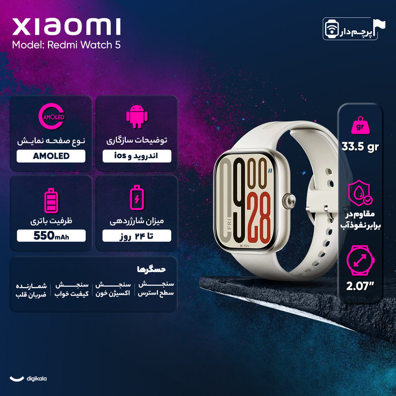ساعت هوشمند 47 میلی‌متری شیائومی مدل Redmi Watch 5 Global گلوبال